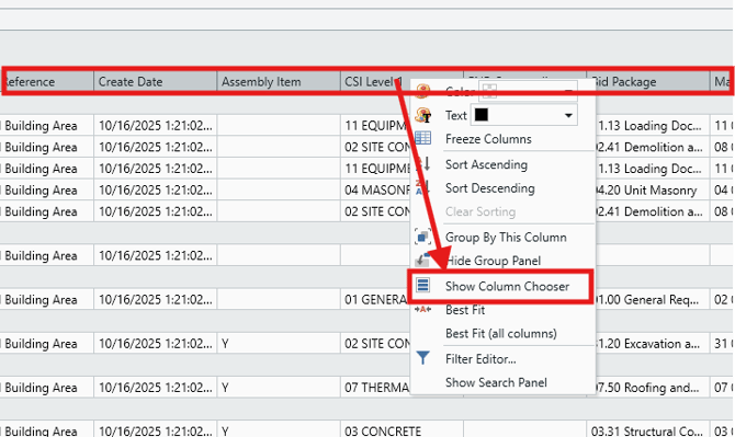 Adding and removing columns in the Estimate View is easy using the Column Chooser. Right-click on any column header and select Show Column Chooser.