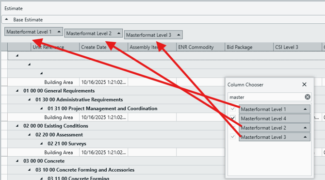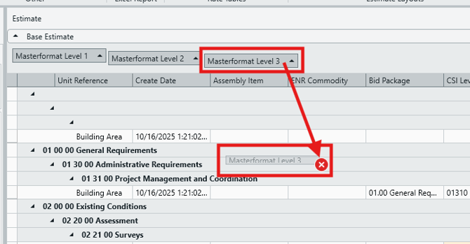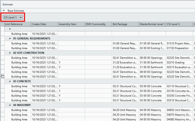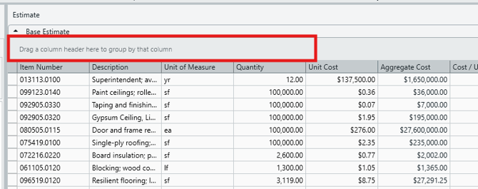 As stated in the UI, one easy way to set grouping is to simply click-and-drag any column header into the Grouping space. In the below example, we have dragged the CSI Level 1 column header into the Grouping space to group all line items by their CSI Level 1 classification.