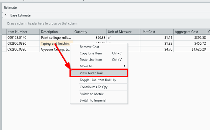 Accessing the Audit Trail via the button shown above is a great way to assess all changes made an estimate, but what if you're only interested in a specific line item? The quickest way to access audit data on a specific line item is by using the right-click menu in the Estimate View: