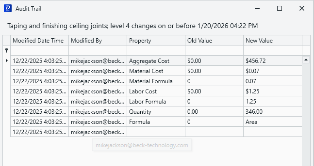 The Audit Trail allows you to track changes made to line items and other elements in your Estimate. It will show who made the change, what was changed, and when.