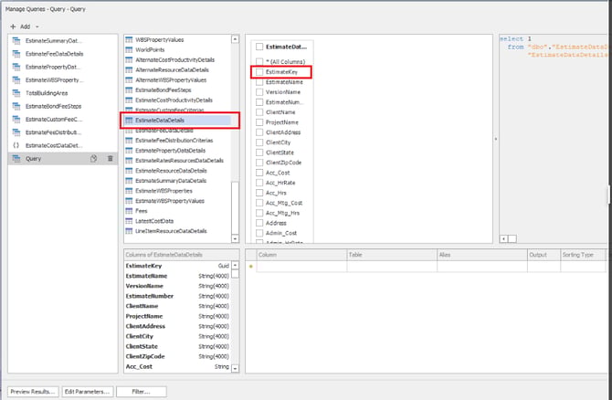 7. You can now select the project properties you need individually or you can simply select All columns. But if you are selecting only specific columns make sure you also select ‘EstimateKey’ in order to build relations with existing queries if needed.