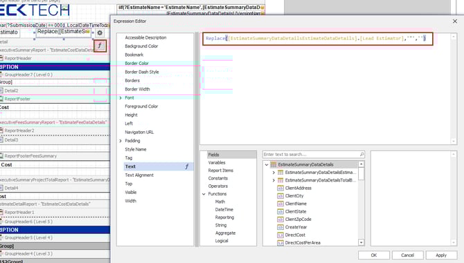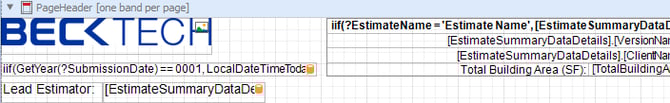19. All the project meta data are now listed under 'EstimateSummaryDataDetailsEstimateDataDetails'. Look for 'Lead Estimator' and drag the field to the desired location on the Page Header for printing.