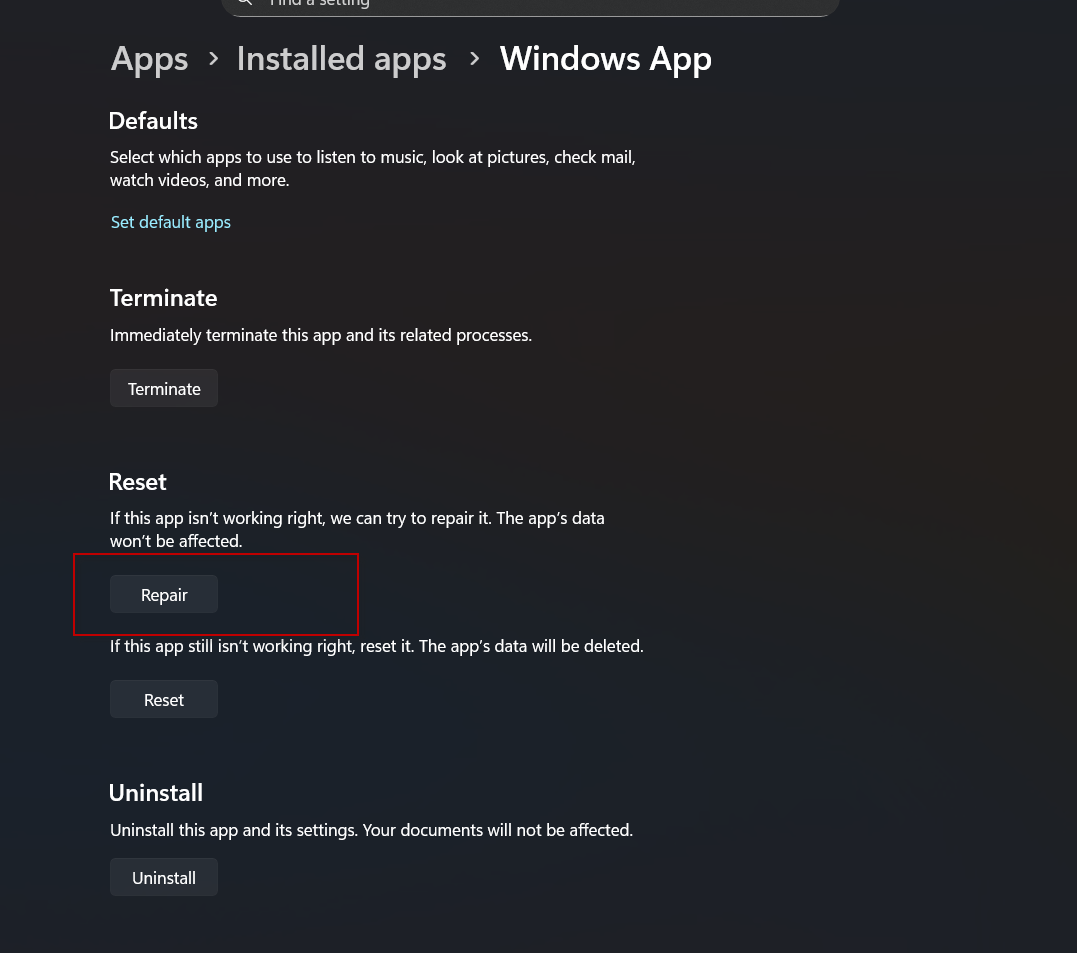 Here are the steps to Repair your Windows App