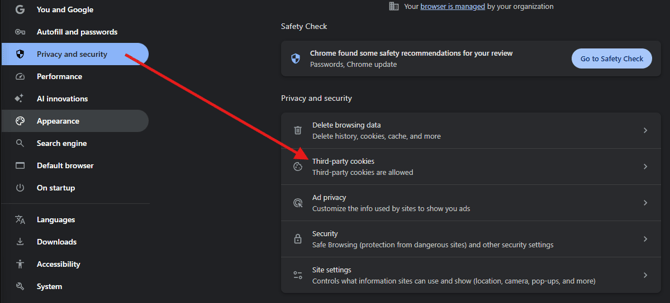 • Navigate to the Privacy and Security Tab in the left menu, and click on Third-party cookies.