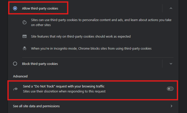 • Disable the option to Send a "Do Not Track" request with your browsing traffic