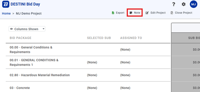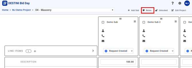 Bid Day allows users to add notes at multiple levels within a Bid Project to support clear communication and documentation between contributors. Notes can be recorded at the project level, the Bid Package level, and on specific elements such as line items and General/Trade Requirements within Bid Packages.