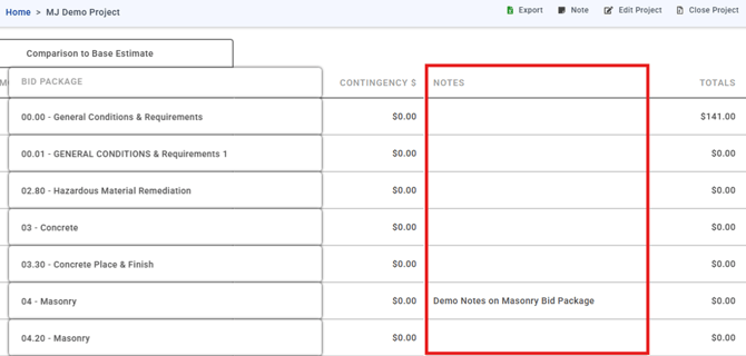 Project-level notes are used for information related to the overall bid project.