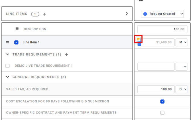 A yellow Notes icon will display on any line item, trade requirement, or general requirement that contains a note entry. Clicking this icon allows users to review or edit existing notes.