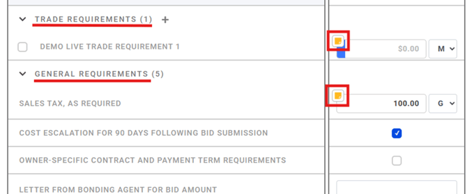 Users can add notes to General Requirements and Trade Requirements within a subcontractor bid that are of the Contributes to Bid type.
